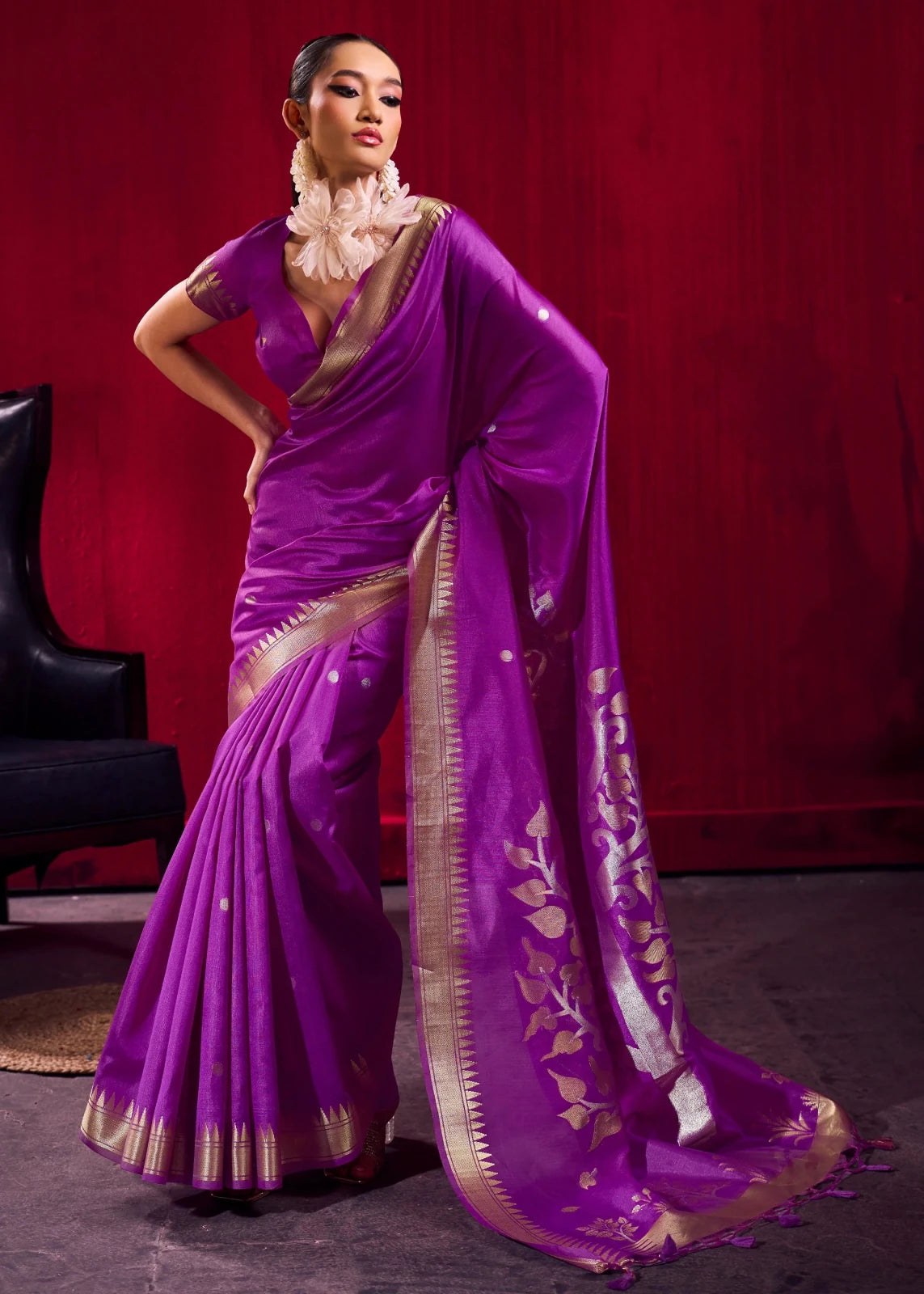 This Bright Purple Banarasi Satin Silk saree features woven gold and silver zari floral and leaf motifs on the pallu, scattered zari butis across the body, a temple-patterned zari border, and tassel detailing. The bold purple colour is a natural fit for Sangeet, Navratri, and Farewell functions. Available at Vasumatis.