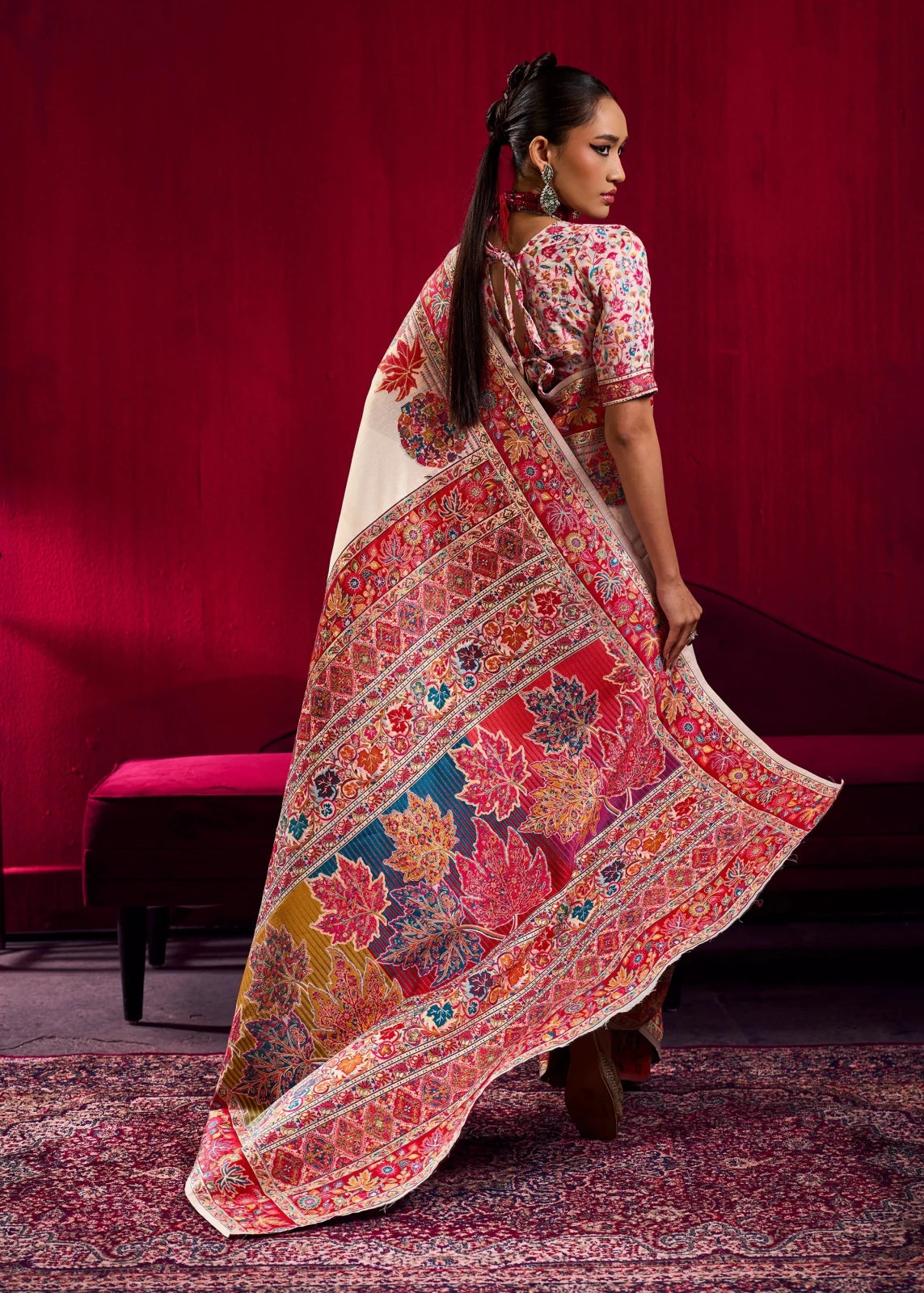 - Blouse Fabric: Matching Pashmina Silk Blend blouse with printed finish