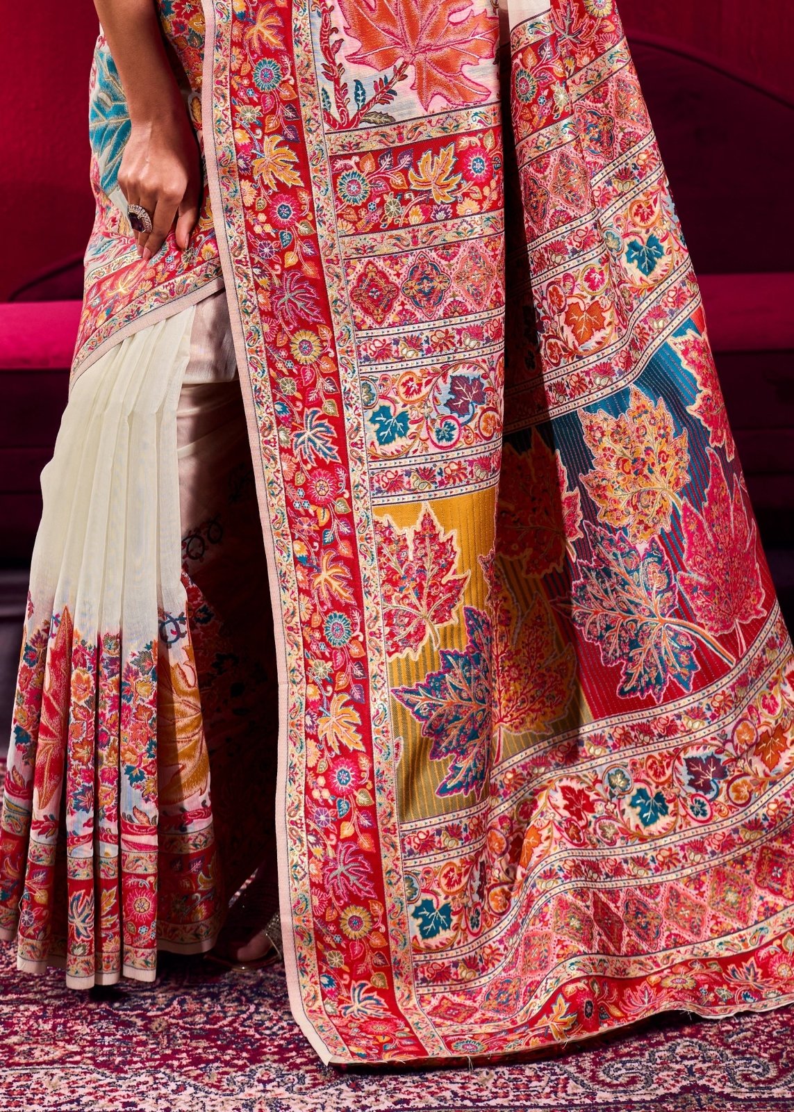 A clean ivory Kashmiri Pashmina saree with a stunning multicolor printed pallu and border packed with floral and leaf motifs in red, pink, teal, yellow, and blue. The soft ivory body feels fresh and timeless, making the colourful pallu stand out beautifully. Available at Vasumatis, this saree works wonderfully for receptions, festive occasions, and celebrations where you want to look graceful and put-together.