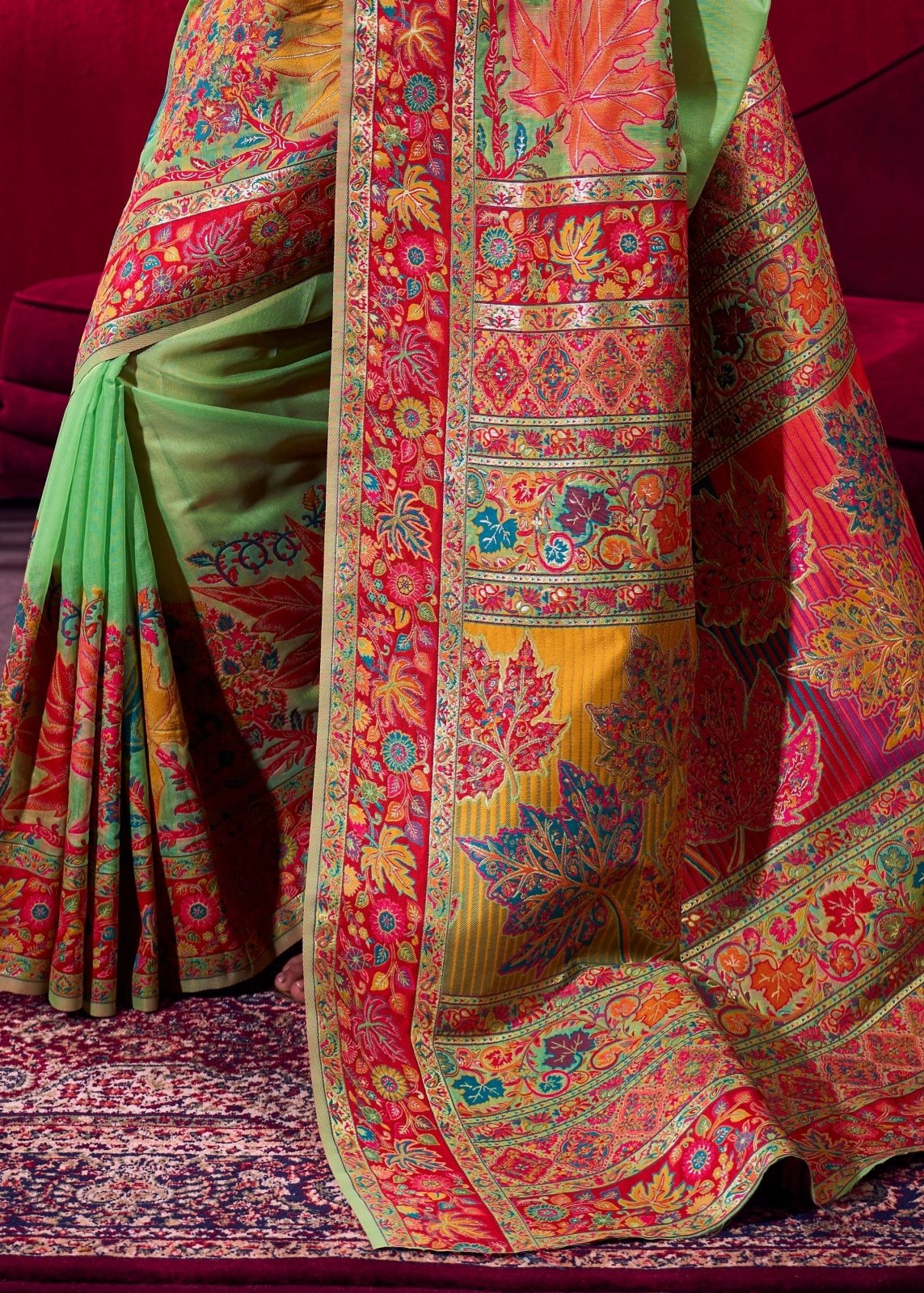 Parrot Green Kashmiri Pashmina Silk Saree